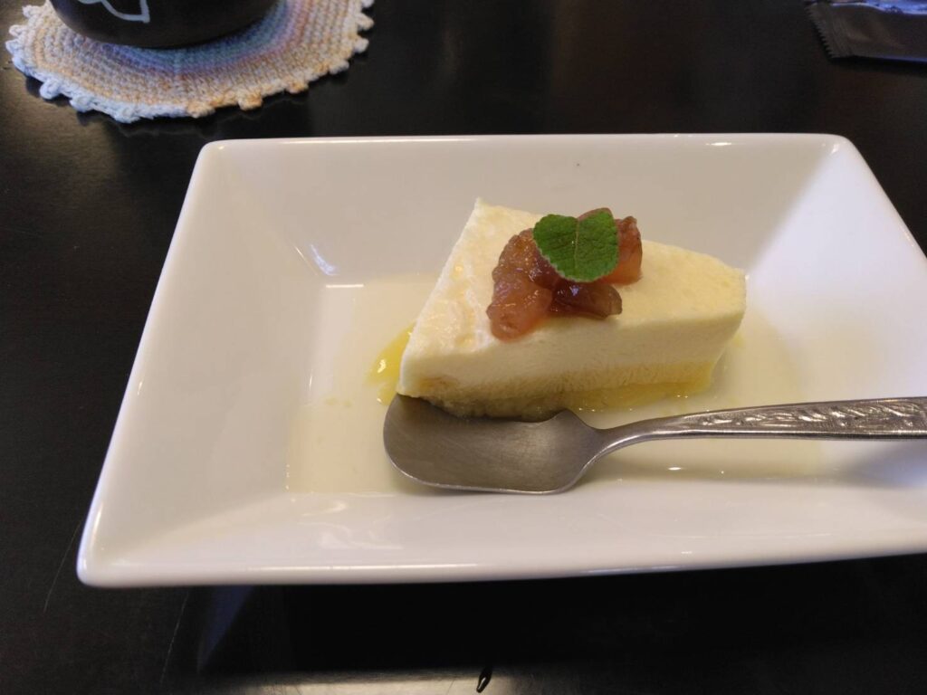 〆のデザートはチーズケーキに爽やかな夏みかんソースがけ、おナスのジャムを添えて